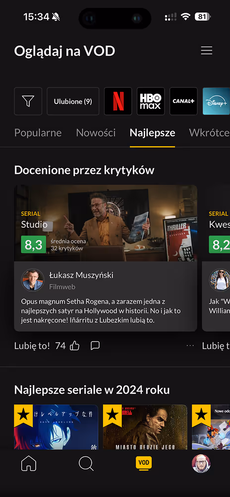 A mobile application created from the ground up for one of the world’s largest movie platforms. The goal was to translate the core experience of Filmweb’s website into a native app focused on simplicity, speed, and the most valuable features for everyday users.